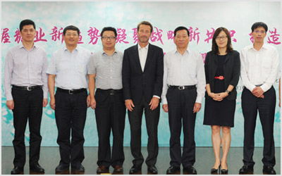 战略论坛主要领导及嘉宾合影,光明集团董事长吕永杰(右四),光明集团副总裁、上海糖酒董事长葛俊杰(左二),上海糖酒总裁崔智均(右一),布瑞克创始人孙彤(左三),路易达孚全球糖业总监Jacques Gillaux(左四)